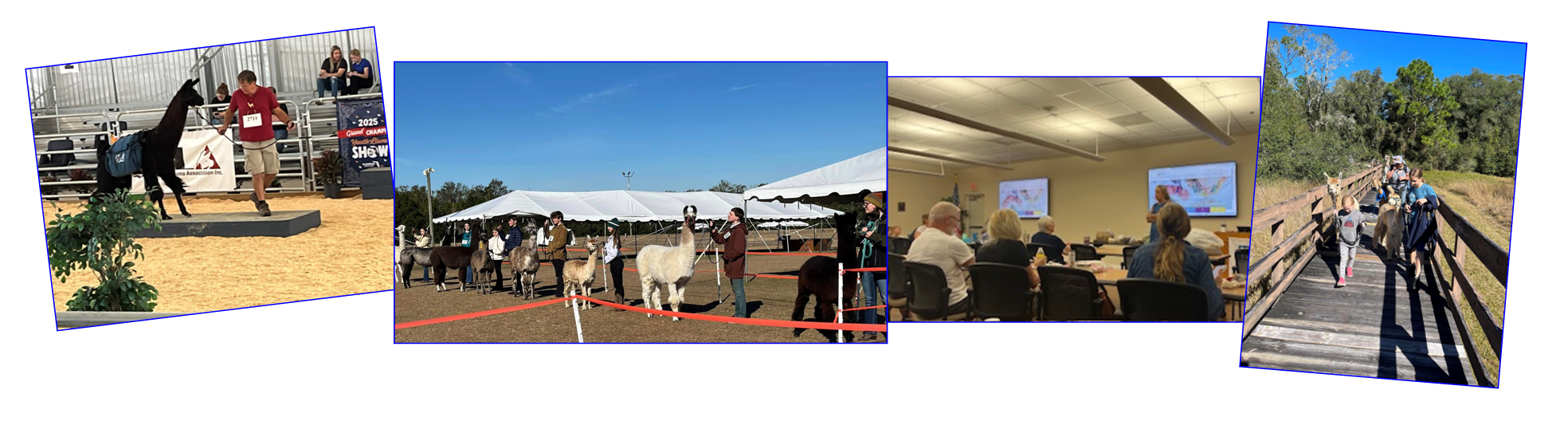 A Message from the President Thank you for visiting our FALA website.As the president of the Florida Alpaca and Llama Association, I want to welcome you to our FALA community! We are a not-for-profit organization and proud sponsors of the Florida State Fair Youth Champion of Champion Program and Southeast Llama Rescue. Are you a Camelid owner in Florida or thinking of becoming one? We are all part of an amazing, sharing, and caring Camelid community, always willing to assist others. Whether it is in-person at meetings or events or online in our FALA Facebook Group, our community communicates and supports our farms. Become a FALA member for just $25 per year! We provide our members with free Camelid educational seminars focusing on such topics as herd health, sheering, fleece projects, agritourism, and other ranch roundtable discussions. We have our annual FALA membership meeting/picnic/hike on Sunday, November 9, 2025. We offer other fun and educational events throughout the year. On January 17 & 18, 2026, we will have our 5th annual Alpaca/Llama Fun Show in Lady Lake, Florida. We are looking for new participants, show sponsors, and craft vendors. It is a fun event for animals, participants, and spectators. Click on the Florida Winter Classic link above for more details and forms. We look forward to more exciting alpaca and llama adventures in the coming year. |